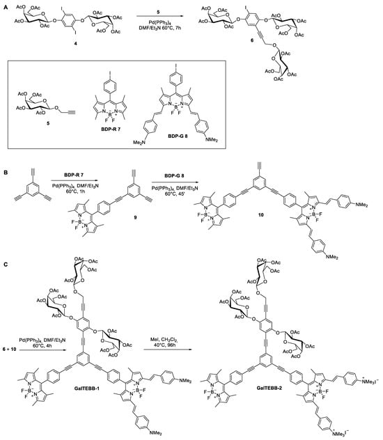 The parallel route for synthesis of bichromophoric species 10 is reported in Scheme 2B. A large excess of 1,3,5-triethynylbenzene was reacted with BDP-R 7 in copper-free Sonogashira conditions for the obtainment of compound 9. The use of a 1:8 stoichiometric ratio between the reactants gave the best results in terms of yield (80%). The excess of 1,3,5-triethynylbenzene was recovered as the first eluate of the column and quantitively recrystallized from hexane. The second chromophore unit BDP-G 8 was inserted into the OPE skeleton, involving compound 9 in a further Pd(0) mediated cross-coupling, which this time was in the presence of a molar defect of BDP-G 8. The reaction conditions were optimized (molar ratio for compound 9 and BDP-G 8 of 3:1) to promote the formation of compound 10 as the main product, a dark green solid, at a 76% yield. Compound 10 contained one last ethynyl arm to be easily connected with galactoconjugate (compound 6). Therefore, once the syntheses of the precursors were completed, the next step was their assembly (Scheme 2C). An easy and straightforward copper-free cross-coupling between compounds 6 and 10 led to GalTEBB-1 at a 47% yield after purification as a dark green solid. The conversion of GalTEBB-1 to bis-tetraalkylammonium GalTEBB-2 was reached using a large excess of iodomethane in DCM at reflux for three days in a sealed tube in order to keep the excess of the toxic volatile reactant and the reaction volume unchanged during the full reaction time. The reaction was quantitative, and deep blue crystals of GalTEEB-2 were recovered by evaporation of the solvent and iodomethane in safe conditions. All the new products were fully characterized by mono- and bidimensional NMR spectroscopy and ESI-mass spectrometry to obtain their proper attributes (ESI, from Figures S4–S6).