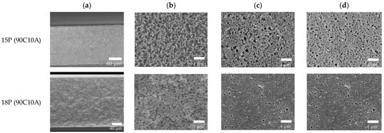 Figure 2, all the membranes exhibit a symmetric morphology filled with interconnected sponge pores. Upon increasing the P(AN-MA) concentration from 15 wt.% to 30 wt.% in the ternary system, the pore size decreases from 0.25 to 0.07 μm, as depicted in