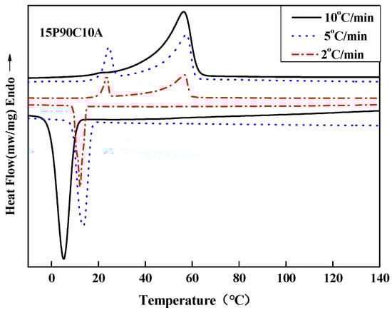 To further demonstrate the influence of the cooling rate on the polymer solution, we measured the crystallization and melting behaviors of 15P(90C10A) mixture in the non-isothermal crystallization process at different cooling rates (10, 5, 2 °C/min, respectively), as shown in