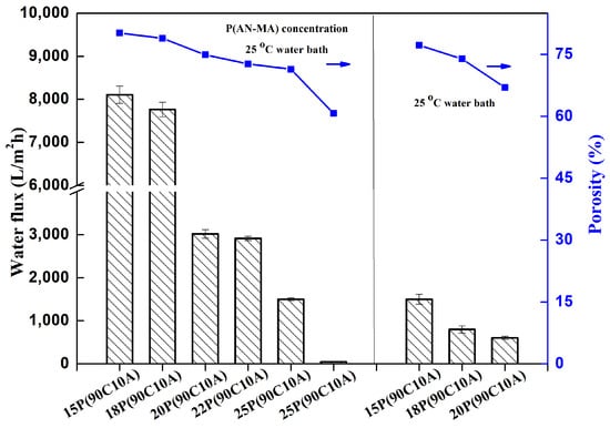 2·h), which was attributed to its largest porosity (81.0%) and pore size (0.25 μm).When the P(AN-MA) concentration was increased from 15% to 30% and fabricated in an air bath, the membrane experienced a decrease in pore size and porosity, leading to a decrease in the water flux from 8107 L/m