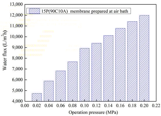 The evaluation of pure water flux for the 15P(90C10A) membrane at different operating pressures ranging from 0.02 MPa to 0.2 MPa with a gradient of 0.02 MPa, as depicted in