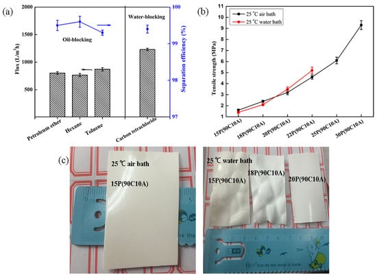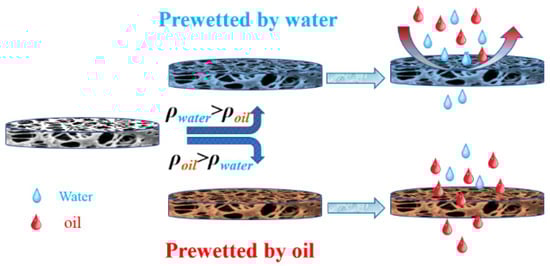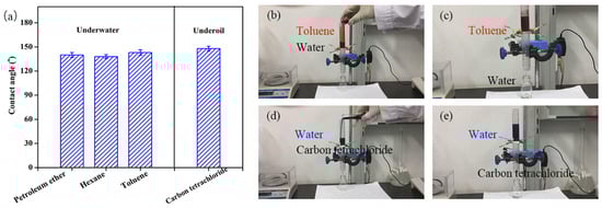 Figure 11b,c, when a mixture of toluene and water was introduced into the separation system, the oil phase (dyed red) was repelled by the underwater hydrophobic membrane, allowing water to permeate the membrane and be collected. When the membrane was pre-wetted with oil before the separation under the same conditions, oil selectively permeated through the membrane while water was retained (