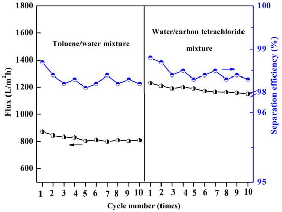 The reliability of the P(AN-MA) membrane was further assessed, as this is an important consideration for practical applications. The membrane maintained its high separation efficiency even after 10 cycles of separation. During each cycle, the membrane was simply washed with ethanol and pure water several times. It was found that the separation efficiency remained above 98.0%, and the water or oil flux values only exhibited a slight decrease after 10 cycles of filtration, as depicted in