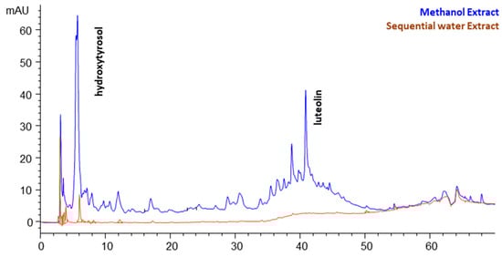 Both extracts were subjected to HPLC-DAD analyses, and Figure 1 depicts an overlay of the two chromatograms monitored at 280 nm. It can be noticed that methanol extract is a more complex mixture of components than water extract. One major compound was identified using spectral data, r.t., and finally an addition of internal standard, namely hydroxytyrosol. The second peak, with r.t = 40.8 min, presented a characteristic flavone-type UV spectrum, and it was identified as luteolin with the addition of the respective standard. In the case of water extract, hydroxytyrosol was also detected, but presented a far lower peak. Also, no new peaks are present in the water extract, just the traces of the primarily recovered compounds by methanol. Therefore, water only extracted the residual compounds of methanol extraction. According to this finding, the above reported values for water extraction could not characterize this solvent individually.