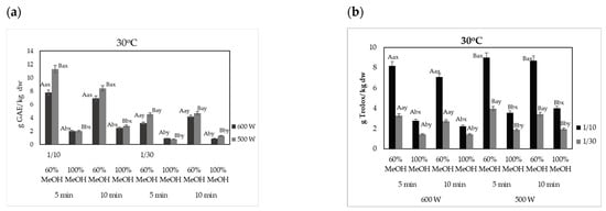 Effect of microwave power and product mass/solvent ratio on (a) the TPC (g GAE/kg dw); (b) antioxidant capacity (g Trolox/kg dw), of the microwave-assisted extracted BACs from olive pomace, at a constant temperature of 30 °C and at solid:liquid ratio 1:10 and 1:30 g/mL. Different letters in the same Figure represent significant differences (p < 0.05) among treatments based on Duncan’s post-hoc comparison test. Superscript letters A, B present significant differences (p < 0.05) between Watt; superscript letters a, b present significant differences (p < 0.05) between solvents; and superscript letters x, y present significant differences (p < 0.05) between solvent to solid ratio.
