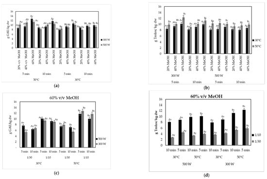 Effect of microwave power and product mass/solvent ratio on (a,c) the TPC (g GAE/kg dw); (b,d) antioxidant capacity (g Trolox/kg dw), of the microwave-assisted extracted BACs from olive pomace, using MeOH-water (v/v mixture) as solvent at 300 and 500 W for 5 and 10 min at 30 and 50 °C and at solid:liquid ratio 1:10 and 1:30 g/mL. Different letters in the same Figure represent significant differences (p < 0.05) among treatments based on Duncan’s post-hoc comparison test. Superscript letters A, B present significant differences (p < 0.05) between temperature; superscript letters a, b, and c present significant differences (p < 0.05) between solvents; and superscript letters x, y present significant differences (p < 0.05) between solvent to solid ratio.