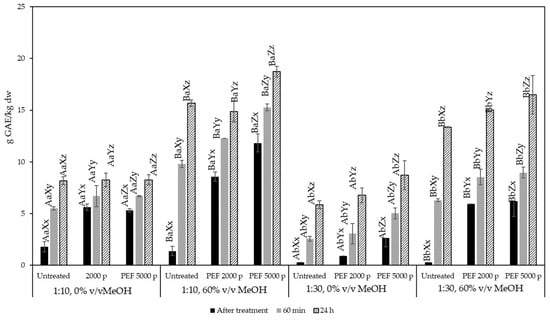 Total phenolic content of olive pomace extracts expressed as g GAE/kg dry olive pomace for untreated and PEF-treated samples (2000 and 5000 pulses) at a solid:liquid ratio of 1:10 and 1:30 g/mL. Different letters represent significant differences (p < 0.05) among treatments based on Duncan’s post-hoc comparison test. Superscript letters A, B present significant differences (p < 0.05) between solvents; superscript letters a, b present significant differences (p < 0.05) between solvent to solid ratio; superscript letters X, Y, and Z present significant differences (p < 0.05) between untreated and PEF treated; and superscript letters x, y, and z present significant differences (p < 0.05) between process times.