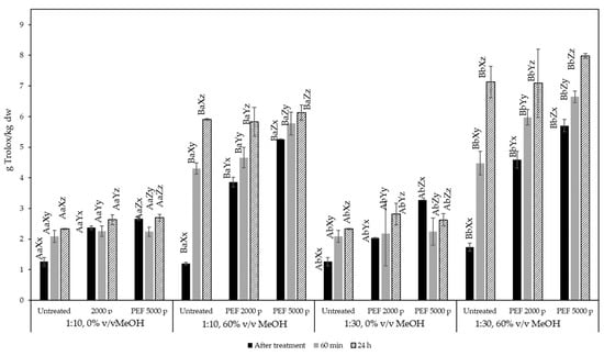 Total antioxidant capacity of olive pomace extracts expressed as g Trolox equivalents/kg dry olive pomace for untreated and PEF-treated samples (2000 and 5000 pulses) at a solid:liquid ratio of 1:10 and 1:30 g/mL. Different letters represent significant differences (p < 0.05) among treatments based on Duncan’s post-hoc comparison test. Superscript letters A, B present significant differences (p < 0.05) between solvents; superscript letters a, b present significant differences (p < 0.05) between solvent to solid ratio; superscript letters X, Y, and Z present significant differences (p < 0.05) between untreated and PEF treated; and superscript letters x, y, and z present significant differences (p < 0.05) between process times.
