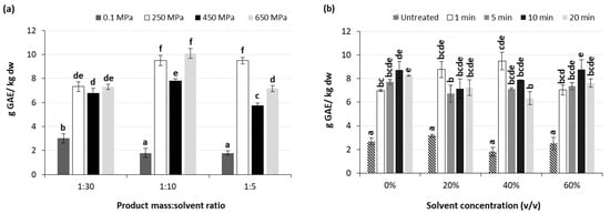 Effect of (a) applied pressure and dried mass to solvent ratio at a methanol concentration of 40% v/v, and (b) processing time and solvent concentration (v/v) at a dried mass to solvent ratio of 1:10 g/mL and pressure level of 250 MPa, on the TPC (g GAE/kg dw) of the high-pressure-assisted extracted BACs from olive pomace at ambient temperature. Different letters in the same Figure represent significant differences (p < 0.05) among treatments based on Duncan’s post-hoc comparison test.