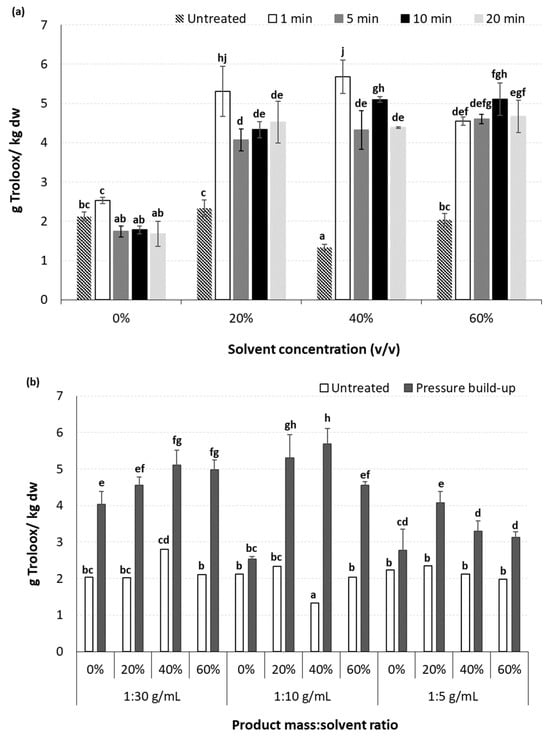 Effect of (a) processing time and methanol concentration at a constant solid:liquid ratio of 1:10 g/mL and applied pressure of 250 MPa, and (b) applied pressure and product solid:liquid ratio on the antioxidant capacity (g Trolox/kg dw) of the high-pressure-assisted extracted BACs from olive pomace, at ambient temperature. Different letters in the same Figure represent significant differences (p < 0.05) among treatments based on Duncan’s post-hoc comparison test.