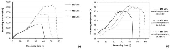 An appropriate amount of grinded air-dried (40 °C for 24 h) olive pomace was transferred into multilayer (PE-aluminum-PET12) pouches and diluted with methanol at a ratio of 1:5, 1:10, and 1:30 g/mL solid to liquid exactly prior to HP treatment. The efficacy of HP on the extractability of BACs from olive pomace was investigated at different HP conditions (pressure range: 250–650 MPa; temperature: 25 °C, and processing time: 40 s–20 min, where 40 s indicate the time required to pressure build-up). HPAE was conducted in a 1.5 L pilot-scale HP unit (Food Pressure Unit FPU 1.01, Resato International BV, Assen, The Netherlands), which operates in the pressure and temperature range of 100–1000 MPa and 0–90 °C, respectively, using water as the transmitting fluid. During HP treatment, continuous monitoring of both pressure (Figure 8a) and temperature (Figure 8b) was performed, using FPU 1.01 software (Resato International BV, Assen, The Netherlands) and PC400 version 2.1 software (Campbell Scientific, Logan, UT, USA), respectively.