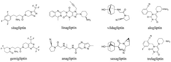 At present, a variety of DPP-4 inhibitors, such as sitagliptin, vildagliptin, saxagliptin, alogliptin, linagliptin, gemigliptin, trelagliptin, and anagliptin, are marketed worldwide (Figure 1). These DPP-4 inhibitors have the advantages of definite hypoglycemic effects, a low risk of hypoglycemia, no weight gain, good cardiovascular safety, and once-daily administration [9,10,11,12,13,14,15]. However, some potential side effects are also associated with them, such as nasopharyngitis, headache, upper respiratory tract infection, and mild gastrointestinal discomfort. Some rare adverse reactions include acute pancreatitis, arthralgia, heart failure, angioneurotic edema, hypersensitivity, elevated liver enzymes, diarrhea, cough, and a decreased absolute lymphocyte count [16,17,18,19,20,21]. In addition, the dosage of some DPP-4 inhibitors needs to be adjusted according to renal function; the exception is linagliptin, which is mainly excreted through the intestine while the others are mainly excreted through the kidney [22,23,24].