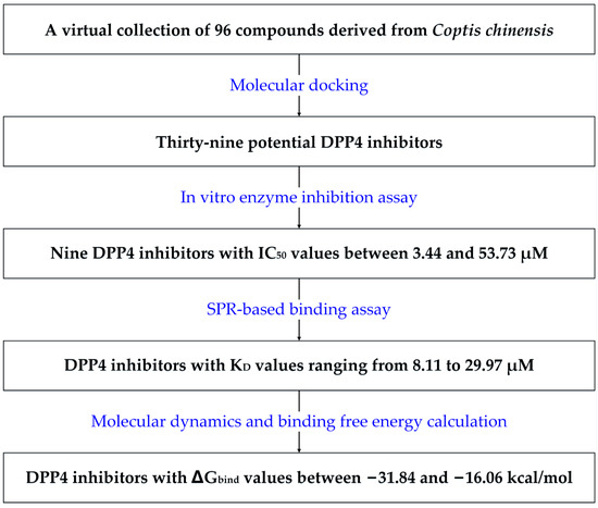This study accomplished the discovery and characterization of DPP-4 inhibitors from components of Coptis chinensis through an integrated approach that combined computational and experimental methods (Figure 2). Initially, molecular docking was performed to identify compounds with the potential to bind with DPP-4. Subsequently, an enzyme inhibition assay was used to validate the inhibitory activity of these potential compounds. Then, the SPR technique was employed to evaluate the affinity of the novel DPP-4 inhibitors for the DPP-4 protein and their binding–dissociation characteristics. Finally, a molecular dynamics simulation technique was used to analyze the interaction between the inhibitors and DPP-4. Natural DPP-4 inhibitors from Coptis chinensis were discovered in this work, which will facilitate the development of safe and effective DPP-4 inhibitors and reveal active ingredients in Coptis chinensis for treating diabetes.
