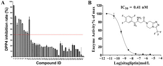 The initial screening results of the inhibitory activity of 39 compounds against DPP-4 (A) and the DPP-4 inhibitory activity of sitagliptin (B). In (A), the compounds represented by Compound IDs 1–40 are sitagliptin (CAS:486460-32-6), columbamine (CAS:3621-36-1), demethyleneberberine (CAS:25459-91-0), epiberberine (CAS:6873-09-2), groenlandicine (CAS:38691-95-1), coptisine (CAS:3486-66-6), berberine (CAS:2086-83-1), palmatine (CAS:3486-67-7), jatrorrhizine (CAS:3621-38-3), berberrubine (CAS:15401-69-1), ethyl caffeate (CAS:102-37-4), picrotin (CAS:21416-53-5), picroside ii (CAS:39012-20-9), protocatechuic acid methyl ester (CAS:2150-43-8), picroside i (CAS:27409-30-9), canadine (CAS:522-97-4), catalpol (CAS:2415-24-9), spongouridine (CAS:3083-77-0), caffeic acid dimethyl ether (CAS:2316-26-9), obacunone (CAS:751-03-1), isovanilline (CAS:621-59-0), D−mannoheptulose (CAS:3615-44-9), androsin (CAS:531−28−2), limonin (CAS:1180-71-8), N−trans−feruloyltyramine (CAS:66648-43-9), gentisic acid (CAS:490-79-9), danshensu (CAS:76822-21-4), sophocarpine (CAS:6483-15-4), sophoridine (CAS:6882-68-4), rhombifoline (CAS:529-78-2), N−methylcytisine (CAS:486-86-2), cytisine (CAS:485-35-8), D−tetrahydropalmatine (CAS:3520-14-7), phellodendrine (CAS:6873-13-8), corypalmine (CAS:27313-86-6), dauricine (CAS:524-17-4), sinomenine (CAS:115-53-7), phellodendrine chloride (CAS:104112-82-5), berbamine (CAS:478-61-5), and oxyberberine (CAS:549-21-3), respectively. The purity of all test compounds is above 98%, and the blank solvent is represented by compound ID 41. The DPP-4 inhibition rate (%) was calculated using the following formula: (maximum fluorescence value—sample fluorescence value)/maximum fluorescence value × 100%. The red dotted line indicates the 40% DPP4 inhibition rate line. In this study, compounds with a DPP4 inhibition rate higher than 40% were selected for further dose-response relationship analysis.