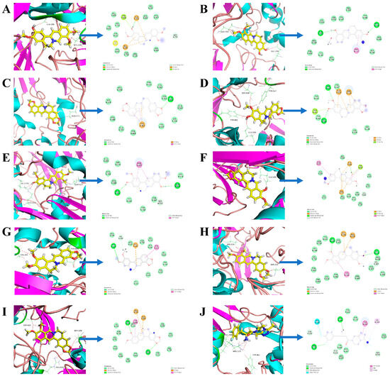The interface of DPP-4 with various compounds including columbamine (A), deMethyleneberberine (B), coptisine (C), groenlandicine (D), Jatrorrhizine (E), berberrubine (F), epiberberine (G), palmatine (H), berberine (I), and sitagliptin (J) at the binding site.