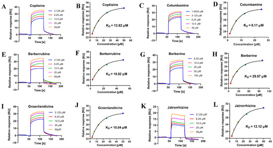 The sensorgrams and fitted curves for the binding and dissociation of DPP-4 with coptisine, columbamine, berberrubine, berberine, groenlandicine and jatrorrhizine (from (A) to (L)). The fitted curves were obtained using the ‘Affinity’ module of the evaluation software Biacore T200.