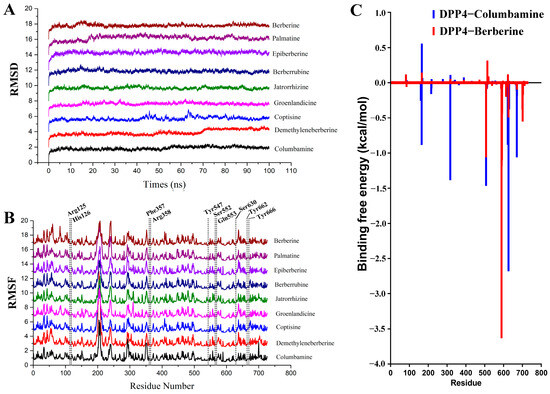 A molecular dynamics simulation analysis of DPP-4 and six of the test compounds. (A) The RMSD of the backbone atoms in the DPP-4–ligand system was calculated to evaluate the stability of the complex. The vertical offset was set to 2 in order to avoid overlap. (B) The RMSF values of the amino acid residues in the DPP-4–ligand system were computed to measure the flexibility of the protein. The key residues involved in binding are marked with dashed lines. The vertical offset was set to 2 in order to avoid overlap. (C) The MM/GBSA decomposition method was applied to estimate the contribution of each residue to the total binding free energies for the DPP-4–columbamine and DPP-4–berberine systems.