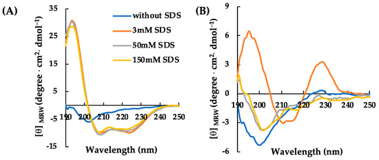 Concerning RiLK30 and AVP2, in the first set of experiments the CD spectra were recorded at a fixed peptide concentration (50 μM) in 10 mM Tris-HCl buffer (pH 7.0) and in the absence or presence of SDS solutions, below and above the critical micelle concentration. As shown in Figure 1, both peptides present a dichroic spectrum in an aqueous solution with the typical shape of a random coil structure characterized by a negative band at ~200 nm. Instead, the presence of SDS significantly affects the CD spectrum of the peptides that underwent a variation in shape when in contact with the oppositely charged amphiphile. Specifically, AVP2 adopts a typical α-helical conformation in SDS solutions at concentrations both lower (3 mM) and higher (50 and 150 mM) than the micellar one (Figure 1A). Conversely, RiLK30 shows a more complex conformation that is not correlated with the common secondary structure elements (α-helix, β-strand, or random coil) (Figure 1B) and can be associated with its high propensity to self-aggregate, as already observed for its analogs RiLK1 and RiLK3 [41,42,43].