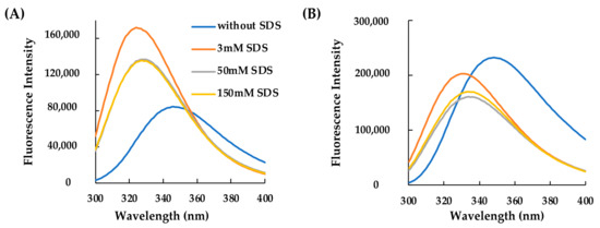 Effect of SDS concentration on the secondary structure of AVP2 and RiLK30 monitored by fluorescence spectroscopy. Fluorescence spectra of (A) AVP2 and (B) RiLK30 at 50 µM concentration and 25 °C in 10 mM Tris-HCl buffer, pH 7.0, in the absence (blue lines) or presence of SDS at different concentrations.