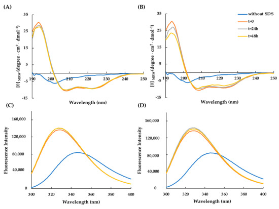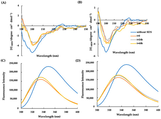 Subsequently, to study the conformational rearrangements of RiLK30 and AVP2 over time, the molecules were incubated for 24 h at 37 °C and pH 7.0, after which the dichroic (Figure 3A,B) and fluorescence (Figure 3C,D) spectra were acquired in the presence of SDS 50 mM. These analyses highlighted that the peptides did not appear to undergo significant changes in the following 24 h once their conformational distribution had been assumed (t = 0).