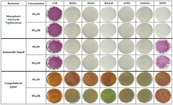 Antibacterial activity of our peptides against the foodborne pathogens monofasic Salmonella Typhimurium, Salmonella Napoli, and Campylobacter jejuni. CTRL: microorganism without treatment. Bacterial cultures treated, or not, with peptides at two different concentrations were seeded on selective plates. The images are representative of three independent experiments performed in triplicate.