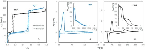 The QE-TPDA profiles reveal a remarkable difference between the mechanisms of the high-temperature desorption–adsorption steps of water and alcohols, which are not visible in the isotherms. The broad desorption maximum of water corresponds to the adsorption minimum and are similar in shape. As a consequence, there is no hysteresis in the integral desorption–adsorption profiles of water in the temperature range 40–150 °C. This type of QE-TPDA profile is characteristic of the pore filling mechanism, often observed for rigid frameworks, e.g., zeolites [21]. However, narrow desorption maxima and adsorption minima of ethanol and 1-propanol show considerable hysteresis, which is indicative of sorption-induced phase transition [23,24].