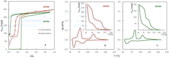 Single component adsorption-desorption isotherms of 1-propanol and 2-propanol on JUK-8 (A) recorded at 25 °C, compared with the QE-TPDA profiles and the corresponding integral curves obtained for 1-propanol (B) and 2-propanol (C) with NDIR detector at heating/cooling rate of 10 °C/min. Sample masses: 7.0 mg (B), 7.2 mg (C).