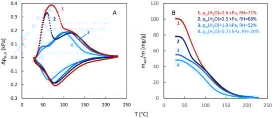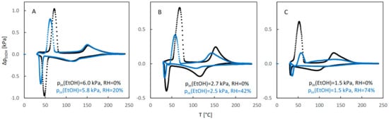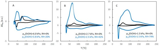 The integral QE-TPDA profiles (Figure 6) reveal considerable desorption–adsorption hysteresis, much larger than in the case of ethanol. It is particularly large at moderate and high relative humidity (Figure 5B,C), where re-adsorption occurs mainly after cooling the sample to the initial temperature (27 °C).