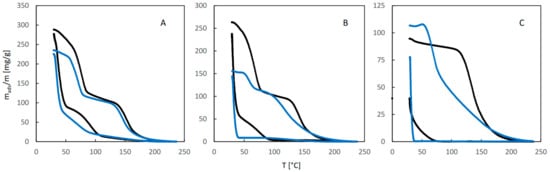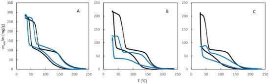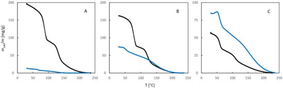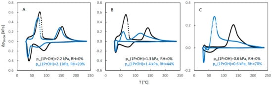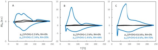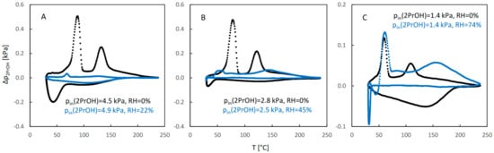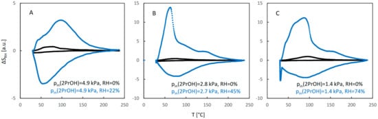 The QE-TPDA profiles of 2-propanol in dry Ar (black points) compared with the profiles recorded in presence of water vapor (blue points) at low (A), medium (B), and high (C) relative humidity. Inlet partial pressures of alcohol correspond to high, medium, and low values of the relative pressure (p/ps), respectively: A: 67–73%, B: 37–42%, C: 21%. All profiles were recorded using NDIR detector, at heating/cooling rate of 10 °C/min. Sample masses: 7.2 mg (A), 7.2 mg (B), 7.2 mg (C).