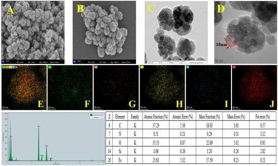 SEM images of Fe3O4 (A) and COF-SiO2@Fe3O4 (B), TEM images of COF-SiO2@Fe3O4 (C,D) and EDS spectra of COF-SiO2@Fe3O4 (E–J).