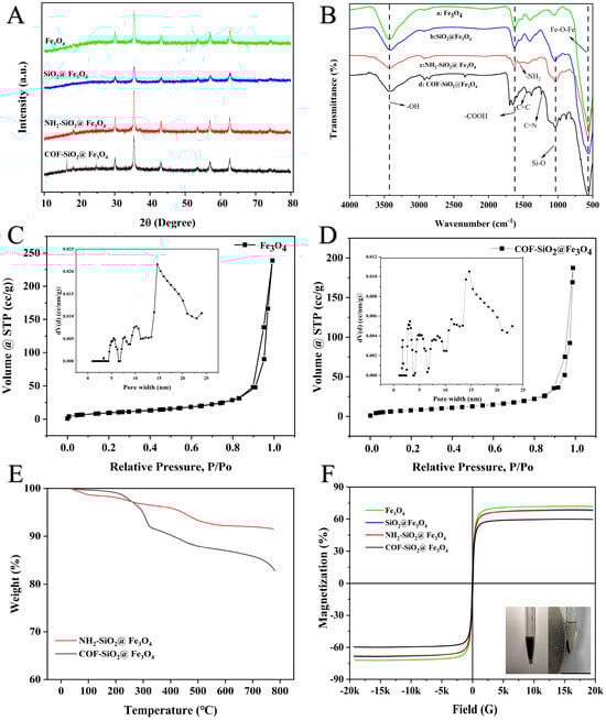 XRD patterns of Fe3O4, SiO2@Fe3O4, NH2-SiO2@Fe3O4 and COF-SiO2@Fe3O4 (A); FTIR spectra of Fe3O4 (B−a), SiO2@Fe3O4 (B−b), NH2-SiO2@Fe3O4 (B−c) and COF-SiO2@Fe3O4 (B−d); N2 adsorption–desorption isotherms of Fe3O4 and COF-SiO2@Fe3O4 (C,D); TGA spectra of NH2-SiO2@Fe3O4 and COF-SiO2@Fe3O4 (E); and magnetic hysteresis curves of Fe3O4, SiO2@Fe3O4, NH2-SiO2@Fe3O4 and COF-SiO2@Fe3O4 (F).
