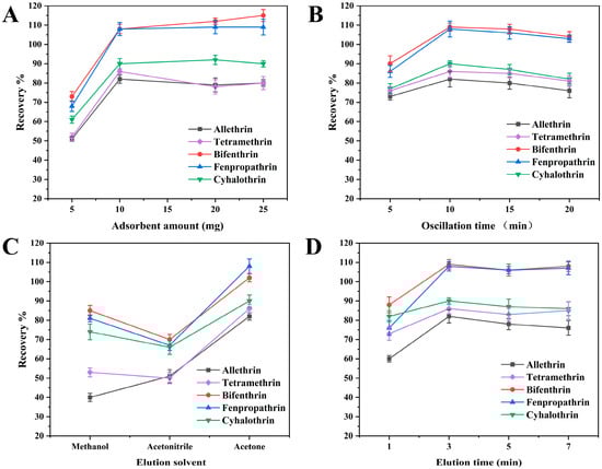 The selection of an appropriate elution solvent is crucial in efficiently desorbing the target analytes from the extracted adsorbents. Here, acetonitrile, methanol and acetone were used as elution solvents to evaluate their elution performance. As depicted in Figure 3C, acetone exhibited significantly improved the desorption efficiency of the target compounds as the elution solvent. Conversely, the recoveries of allethrin were low when methanol was used as the eluent solvent, while the recoveries of the five PYRs were generally low when acetonitrile was employed as an eluent solvent. Hence, acetone was selected as the optimal elution solvent for subsequent experiments.