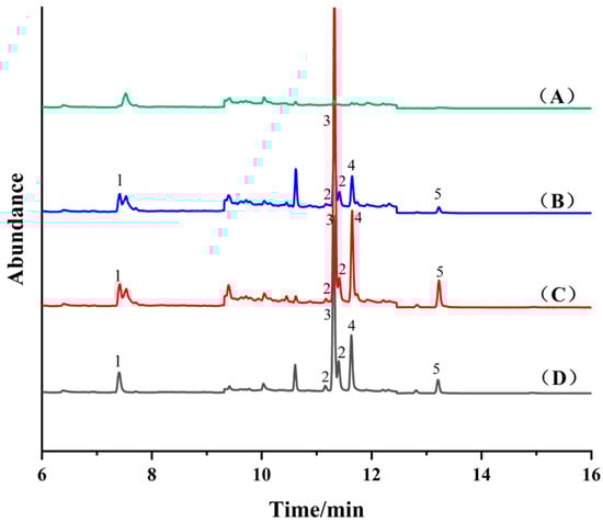 Total ion flow chromatography of blank cabbage sample (A) and spiked cabbage sample (50 μg⋅kg−1) after purifcation by Fe3O4 (B), NH2-SiO2@Fe3O4 (C), COF-SiO2@Fe3O4 (D), respectively. 1—Allethrin, 2—Tetramethrin, 3—Bifenthrin, 4—Fenpropathrin, 5—Cyhalothrin.