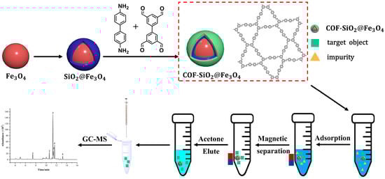 A covalent organic framework (COF) is a new type of porous polymer material that can be constructed with organic building units via covalent bonds of elements (C, O, N, H, etc.) [25]. The structure and surface properties are predominantly dependent on covalently linked topological schemes and organic monomers. They exhibit exceptional characteristics, including an adjustable pore size and high chemical stability, rendering them highly promising for applications in catalysis [26,27], sensing [28], optoelectronic devices [29] and separation [30,31]. However, the challenge of separating COFs from a solution due to their low density impedes their widespread application in separation and enrichment. Fortunately, the combination of COFs with Fe3O4 provides a potential solution to this issue, mitigating the substantial loss of COFs and facilitating their practical utilization.
