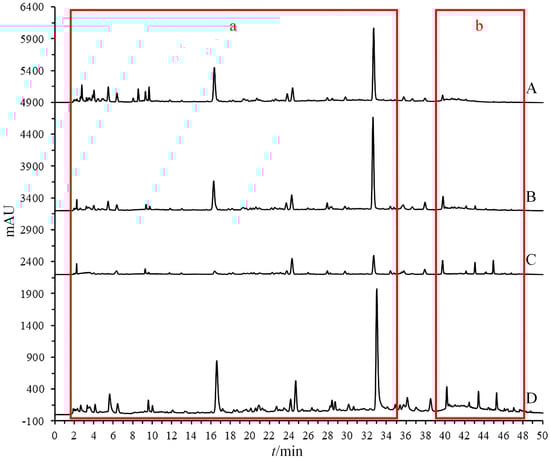 Chromatographic comparison of offline and online extraction methods (water extraction (A), 50% methanol extraction (B), anhydrous methanol extraction (C), and OGPLE (D)) with high-polarity components (a) and low-polarity components (b). OGPLE: online gradient pressure liquid extraction.