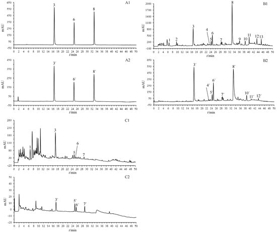 OGPLE coupled with HPLC antioxidant analysis system for dandelion aerial part and dandelion root samples. (A) Standard solution; (B) dandelion aerial parts; (C) dandelion roots. (A1,B1,C1) Total compound chromatograms. (A2,B2,C2) Fe2+-TPTZ peaks detected after reaction with FRAP solution. Peak Assignments: 1. uric acid, 2. adenosine, 3. caftaric acid, 4. aesculetin, 5. neochlorogenic acid, 6. caffeic acid, 7. caffeoylmalic acid, 8. cichoric acid, 9. luteolin 7-O-glucoside, 10. 3,5-Di-caffeoylquinic acid, 11. phlorizin, 12. luteolin, 13. unknown. OGPLE: online gradient pressure liquid extraction; HPLC: high-performance liquid chromatography; TPTZ: ferric tripyridyltriazine; FRAP: ferric reducing–antioxidant power.