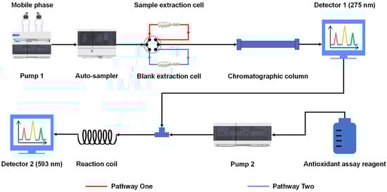 Lately, integrating high-performance liquid chromatography (HPLC) with antioxidant assessment has become a refined approach for analyzing antioxidants, attributed to its distinct benefits. Offline coupling methods such as ABTS/DPPH-HPLC provide an approach for screening potential antioxidants [12,13]. However, the analysis process can be complex, involving steps such as sample extraction, reaction of the sample with ABTS/DPPH, and HPLC analysis of both the sample solution and the reaction solution. To address these limitations, recent developments have introduced online coupling methods of HPLC and antioxidant evaluation, such as HPLC-DPPH/ABTS/FRAP [14,15,16]. A significant advantage of these methods is their ability to integrate separation and activity evaluation. This integration can effectively bypass some unnecessary analytical steps, thereby saving time. These methods streamline the analysis process, making it more efficient and less labor-intensive, and could be applied in antioxidant research.