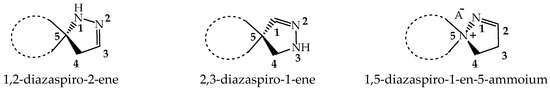 Spiropyrazolines, also known as a spirocyclic hydrazine moiety, are rigid asymmetric heterocyclic structures with a chirality axis and with possible centers of chirality of C-5 carbon atoms in the most-studied examples: 1,2-diazospiro- and 2,3-diazospiropyrazolines [13,14] or the ammonium nitrogen atom N(+)-5 in the 1,5-diazospiropyrazolinium systems (Figure 1). There is evidence of tautomerism in the 1,2-diazospiropyrazolines group [15].