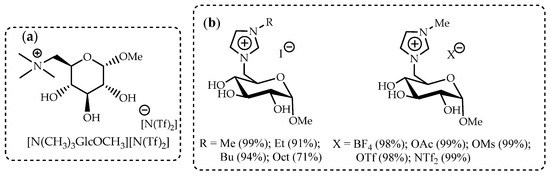 A systematic study on the influence of different ether groups on the secondary OH groups as well as different configurations on physical properties such as melting point, thermostability, and especially the influence on cell toxicity has been carried out on a series of carbohydrate pyridinium salts based on α- and β-methyl-, β-allyl-, and β-phenyl D-glucopyranose, as well as four 1-deoxypentoses with anions (trifluoromethanesulfonate, tosylate, and mesylate) [91].