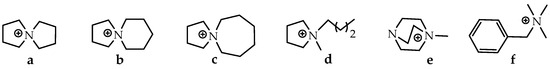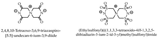 The choice of cation has a strong impact on the properties of an ionic liquid and will often define its stability. The chemistry and functionality of ILs are, in general, controlled by the choice of anion. The combination of a wide variety of cations and anions leads to a theoretically possible number of 1018 ILs. However, a realistic number will be magnitudes lower. Today, about 1000 of these compounds are described in the literature, and approximately 300 are commercially available. The typical structures combine organic cations with inorganic or organic anions (Figure 3) [28].