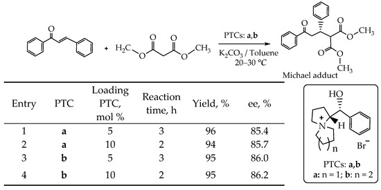 - Mahajan, D.P.; Godbole, H.M.; Singh, G.P.; Shenoy, G.G. Enantioselective Michael addition of malonic esters to benzalacetophenone by using chiral phase transfer catalysts derived from proline-mandelic acid/tartaric acid. J. Chem. Sci. 2019, 131, 67. [Google Scholar] [CrossRef]