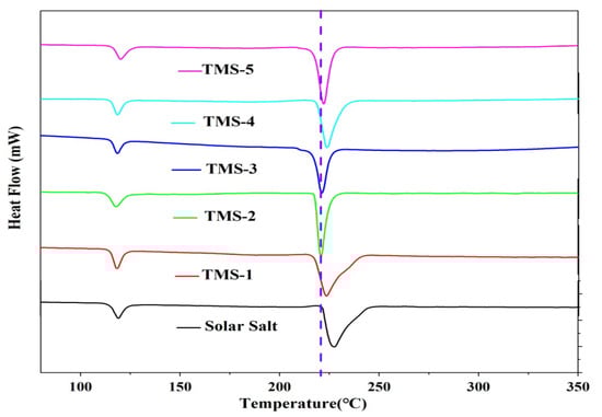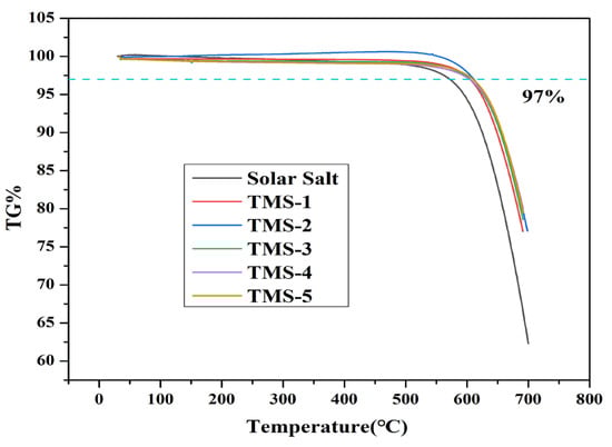 The DSC and TG experimental results for solar salt and TMS are presented in Figure 1 and Figure 2 and Table 1, respectively. The smaller sharp endothermic peak of solar salt and TMS at 117–120 °C represents a solid–solid phase transition of KNO3, while the peak at 220–228 °C represents a solid–liquid phase change. The melting point of solar salt was 227.47 °C, which was consistent with the results reported in the literature [38,39,40]. The melting point of TMS ranged from 220.97 °C to 223.68 °C. The lowest melting point of TMS was 220.97 °C, with a composition of NaNO3 (42.01%)-KNO3 (56.30%)-Na2SO4 (1.69%), which was consistent with the results reported in the literature [34]. TMS-2 had a melting point 6.5 °C lower than that of solar salt. Furthermore, the TG curves suggested that the decomposition temperatures of solar salt and the TMS system were different. The decomposition temperature of solar salt was 572.32 °C, which was consistent with the results reported in the literature [38,39,40]. From Figure 2, it can be seen that the decomposition temperatures of the TMS series of molten salt were within the range of 604.01 °C–611.25 °C, with a sodium sulfate content of 1–5%, with a small change. The highest decomposition temperature was 611.25 °C, which was 38.93 °C higher than that of solar salt. The use temperature range of TMS molten salt was 45.43 °C larger than that of solar salt, which had been widened about 13.17%. This was because the decomposition temperature of sodium sulfate was 884 °C, so the TMS decomposition temperature significantly increased while significantly improving the thermal storage performance and photothermal conversion efficiency of TMS. The latent heat of the phase transition of ternary interactive TMS molten salt increased from 94.86 J∙g−1 to 117.5 J∙g−1, with little change compared to solar salt. In short, the addition of sodium sulfate broadened the use of the temperature zone and reduced the cost to a certain extent. These results show that TMS was more stable and had a larger range of working temperature than solar salt.