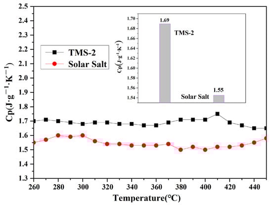 The specific heat capacity represents the amount of heat absorbed per unit temperature per unit mass of molten salt, and is an important parameter characterizing the thermal storage performance of molten salt energy storage materials. The specific heat capacity of TMS-2 molten salt and solar molten salt in the molten state varied with temperature, as shown in Figure 6. It is noted that the specific heat capacity of TMS-2 and solar salt was not significantly related to temperature changes. Within the testing temperature range, the average specific heat capacities of TMS-2 and solar salt were 1.69 J·K−1·g−1 and 1.55 J·K−1·g−1, respectively. The specific heat capacity of TMS-2 was 9.03% higher than that of solar salt. This was because of the differences in the composition and morphology of TMS-2 and solar salt. The above results indicate that TMS-2 molten salt had certain advantages in the application of CSP in terms of specific heat capacity compared with solar salt.