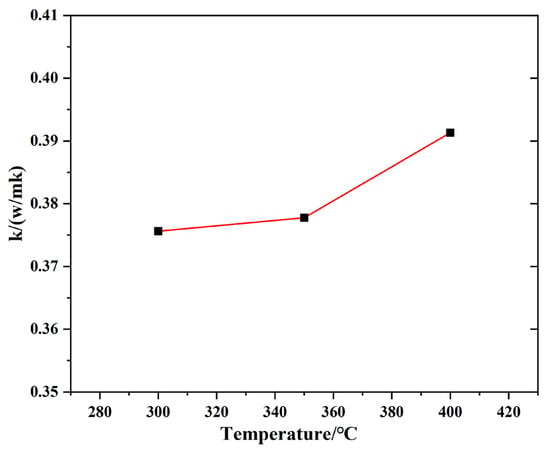 where Cp is the specific heat capacity, ρ is the density and α is the thermal coefficient. The thermal conductivity of TMS-2 at 300 °C–400 °C in nitrogen is shown in Figure 7. The thermal conductivity of TMS-2 was higher, similar to solar salt [45].