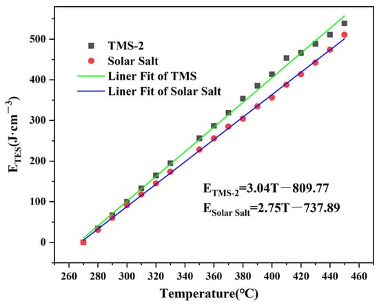 The inlet temperature was 50 °C higher than the melting point in order to meet industrial needs. For TMS-2 and solar salt, 270 °C was confirmed as the inlet temperature. Figure 8 shows the ETES of TMS-2 and solar salt in the temperature range of 260–460 °C. The ETES of the two molten salts increased with the increasing temperature. The higher ETES of TMS-2 than that of solar salt indicated that TMS-2 was expected to be the alternative fluid for energy storage.