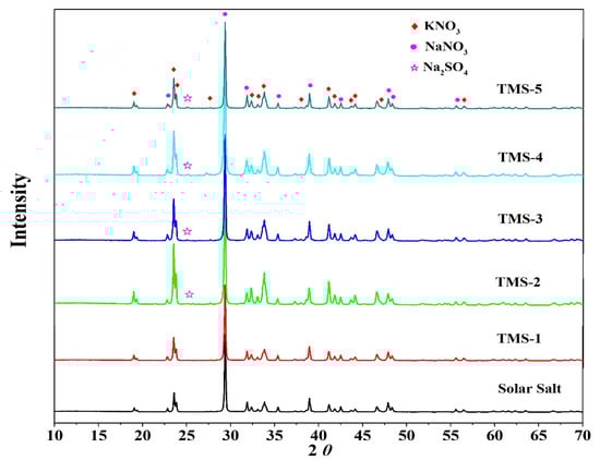 To confirm the composition of the new molten salt, the TMS series of molten salt and solar salt were characterized by XRD. Figure 9 shows the XRD spectra of the TMS series and solar salt. It is noted that solar salt was formed of potassium nitrate and sodium nitrate and the TMS system consisted of potassium nitrate, sodium nitrate and sodium sulfate. In the TMS series of molten salt, a characteristic peak of sodium sulfate appeared at 25° from TMS-2 to TMS-5. As the sodium sulfate content increased from 1.69 to 5%, the intensity of the characteristic peak increased. Due to the sodium sulfate content being lower than the detection limit of XRD, no sodium sulfate appeared in TMS-1. The XRD data showed that the composition of the synthesized new molten salt was consistent with the design synthesis.
