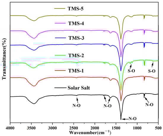 The FTIR spectra of solar salt and the TMS series are shown in Figure 10. It is seen that the characteristic absorption peak near 833 cm−1 corresponded to the N-O bending mode. The characteristic wide peak at 1382 cm−1 corresponded to the N-O asymmetric stretching mode. The absorption band at 1628 cm−1 was because of the 2-fold bending peak of N-O. The two weak bands at around 1790 cm−1 corresponded to the symmetric stretching and asymmetric planar bending of N-O. The weak bands at around 2484 cm−1 corresponded to the symmetric and asymmetric stretching modes of N-O [48]. When the content of sodium sulfate was greater than 1.69% (TMS-2), the characteristic peak of 620 cm−1 in the infrared spectrum belonged to the S-O symmetric stretching mode, and the characteristic wide peak at 1130 cm−1 belonged to the S-O asymmetric stretching mode [49]. Due to the low content of sodium sulfate in TMS-1, no characteristic peak of S-O was detected. The infrared spectrum results showed that the composition of the synthesized new molten salt was consistent with the design synthesis, which validated the XRD results.