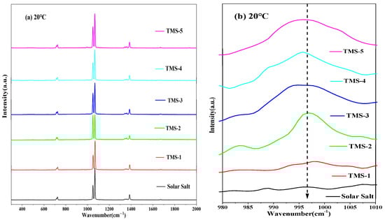 Raman diagrams of solar salt and TMS of series molten salt at 300 °C ((a) 300 cm−1 to 2000 cm−1; (b) 980 cm−1 to 1010 cm−1).