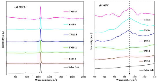 The structural variation information of the corresponding substances can be characterized by the Raman spectra. Figure 11 and Figure 12 show the Raman spectra for the solid state (20 °C) and molten state (300 °C) of solar salt and TMS series of molten salt from 300 cm−1 to 2000 cm−1, respectively. It is clearly observed that the bands at about 716 cm−1, 1050 cm−1 and 1358 cm−1 at 20 °C in the solid state of solar salt and TMS series of molten salts were attributed to the vibrations of NO3− in KNO3.Furthermore, 727 cm−1, 1070 cm−1 and 1386 cm−1 corresponded to NO3− in NaNO3. Compared with 20 °C, at 300 °C, the characteristic peaks of NO3− of the stretching vibration peaks in KNO3 and NaNO3 were changed into one peak at about 730 cm−1 and 1050 cm−1 because of the inhomogeneity and randomness of the ion cluster microstructure with increasing temperature [50], while weaker peak shapes at about 130–1440 cm−1 were not observed. This also illustrated that the arrangement of the cations around NO3− was very uniform when the two systems were in a solid state [51,52]. It can be seen from Figure 11b that the weak characteristic peak at 995–1000 cm−1 was because of SO42− when the mass fraction of sodium sulfate was greater than or equal to 1.69% at 20 °C. It was concluded that a new molten salt containing sodium sulfate was synthesized. Due to the low content of sodium sulfate in TMS-1, no characteristic peak of S-O was detected, which was consistent with the conclusion of XRD and FTIR. However, Figure 11b shows a weak characteristic peak at 995–1000 cm−1 belonging to the Raman peaks of SO42− when the mass fraction of sodium sulfate was greater than or equal to 2% at 300 °C in the molten state of TMS. This was because of an increase in the randomness of the ion cluster microstructure while temperature increased. It is concluded that the stronger interaction between Na+ and SO42− in TMS-2 contributed to the higher specific heat.