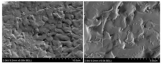 Figure 13 shows a SEM image of the surface of the TMS-2 molten salt crystal. In Figure 13, it can be clearly observed that the surface of TMS-2 molten salt was uniformly distributed with strip-like protrusions compared to the smooth surface morphology of solar salt reported in the literature [30]. The particle size of TMS-2 molten salt was larger than that of solar salt. Larger particles may be able to increase specific heat capacity.